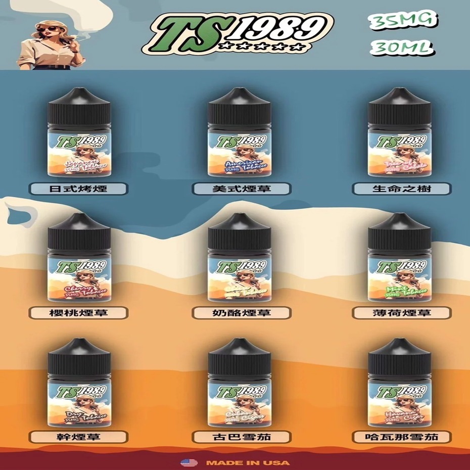 TS1989 小煙油是專為「小煙設備」設計的高品質尼古丁鹽煙油。全系列為 30 mL 容量、35 mg 尼古丁鹽濃度,主打「高濃度、低擊喉、真煙味」,適用於天頂星、酪梨寶寶、OXVA 等主流小煙主機。產品通過 ISO22000 & GMP 認證,使用美國 USP 級原料,品質安心。